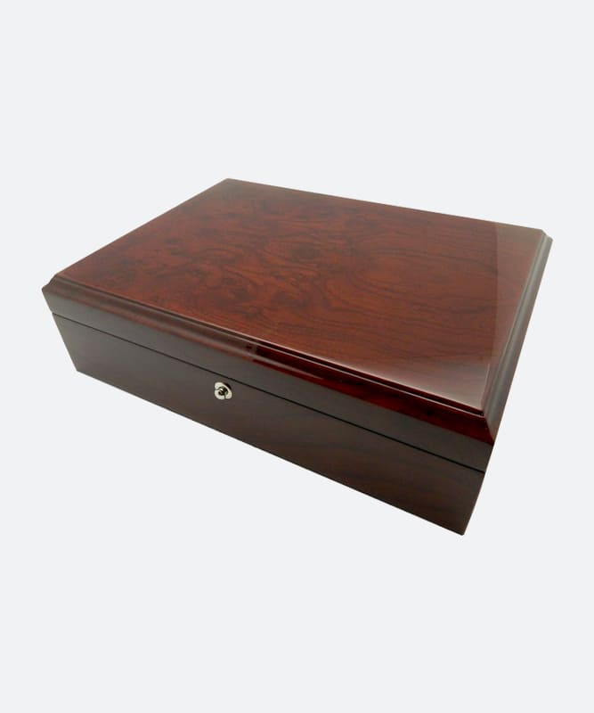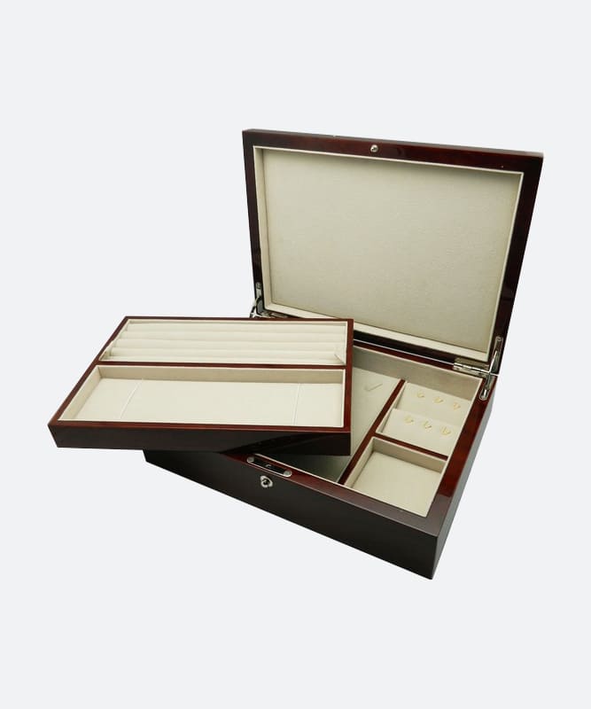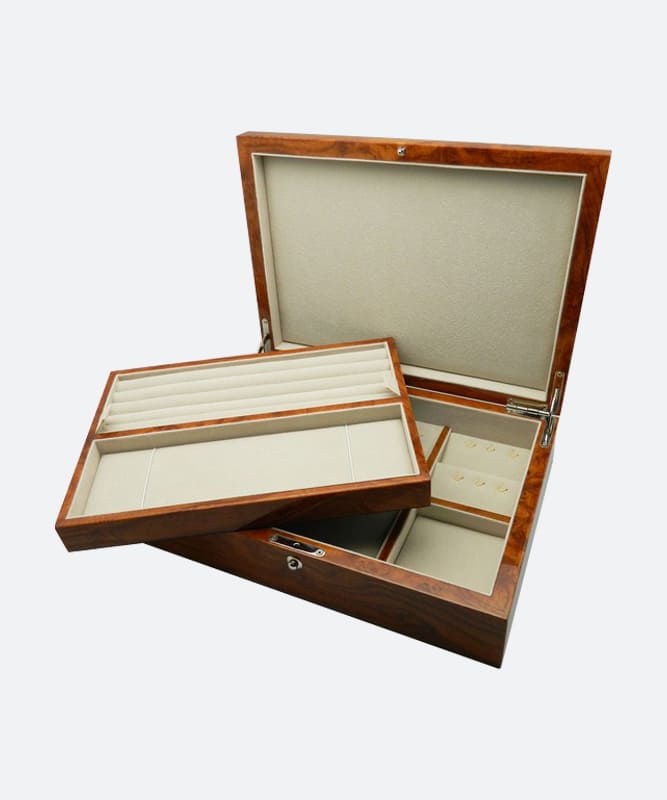 จิวเวลรี่เคส รุ่น No. 4010JW เป็นเคสเก็บเครื่องประดับขนาดใหญ่ทรงแบนขอบเหลี่ยม ภายนอกตัวเคสออกแบบให้ดูหรูหราด้วยการใช้วัสดุไม้เนื้อเงา ภายในเคสมี 2 ชั้น ชั้นบนเป็นถาดที่ถอดออกได้ และอีกล่างเป็นพื้นที่แบ่งช่องสำหรับเก็บเครื่องประดับอย่างเป็นสัดส่วน